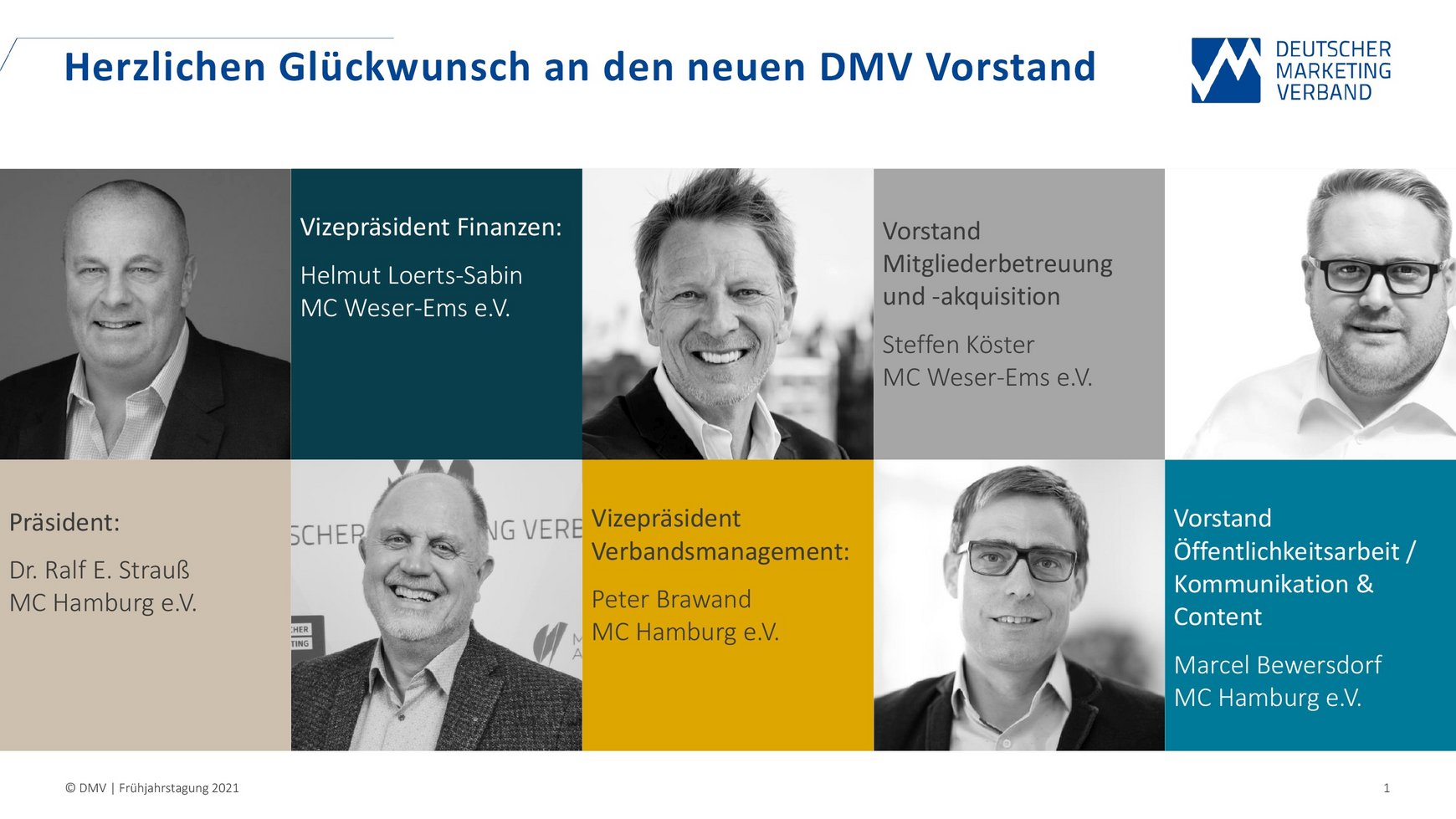 Die Mitgliederversammlung des Deutschen Marketing Verbands e.V. (DMV) hat am 11. Juni 2021 im Rahmen einer digitalen Frühjahrstagung stattgefunden. Alle zwei Jahre wird in diesem Rahmen auch der Vorstand gewählt: Fünf neue Gesichter freuen sich auf die Vorstandsarbeit im DMV, vier Vorstände plus der Präsident Dr. Ralf E. Strauß wurden für weitere zwei Jahre einstimmig im Amt bestätigt. Neue Ressorts, neue Schwerpunkte und ein neues Erscheinungsbild machen das Angebot des DMV in Zukunft noch attraktiver, digitaler und vielfältiger.